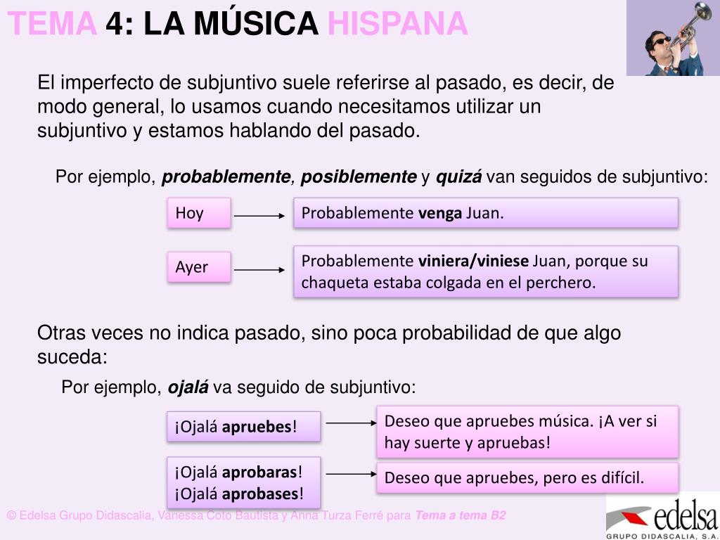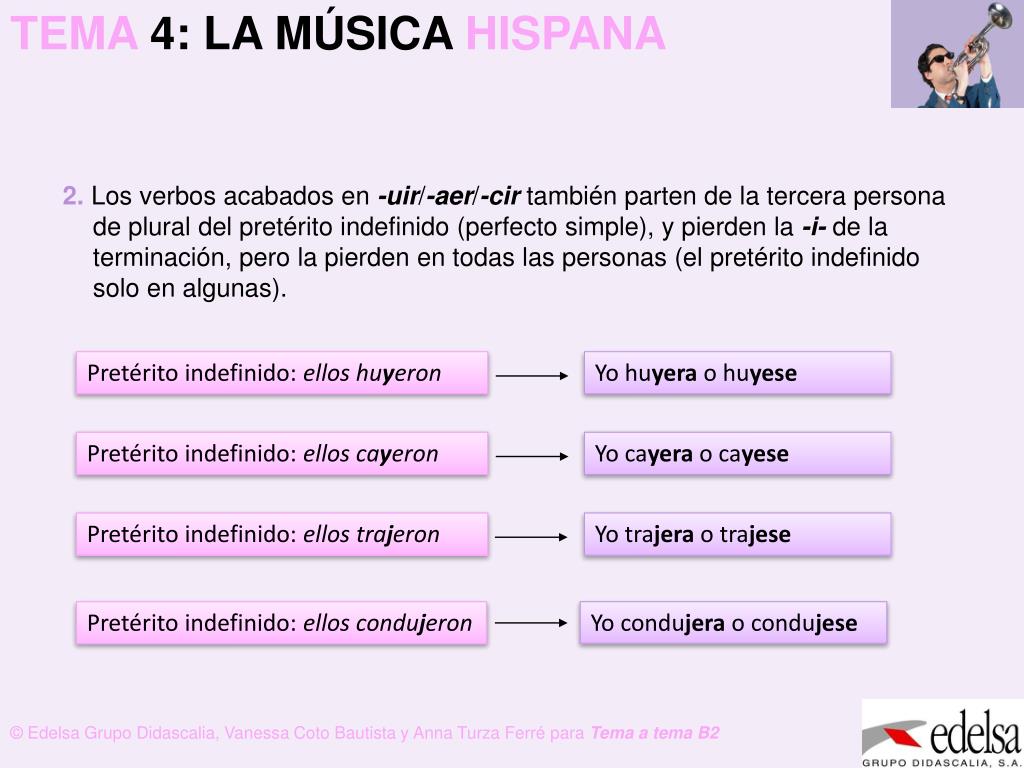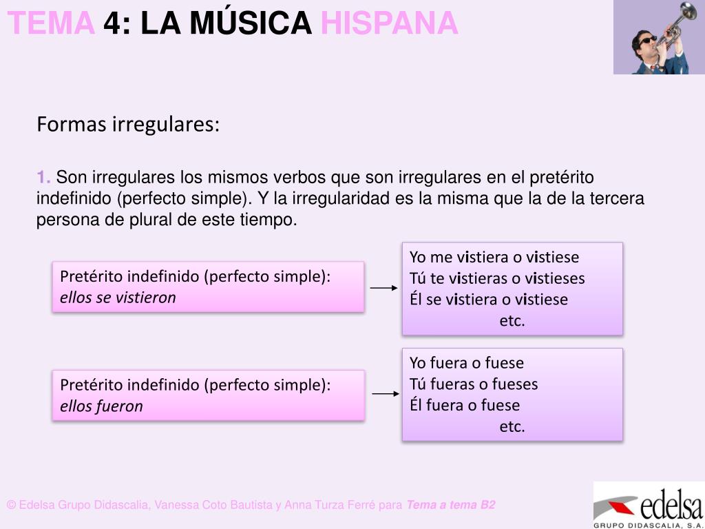 Tema 4 La música hispana. Imperfecto de subjuntivo Forma:. El imperfecto de subjuntivo se forma añadiendo a la raíz del verbo las siguientes terminaciones. -ara/-ase -aras/-ases -ara/-ase -áramos/-ásemos -arais/-aseis -aran/-asen. Primera conjugación (verbos en -ar ).