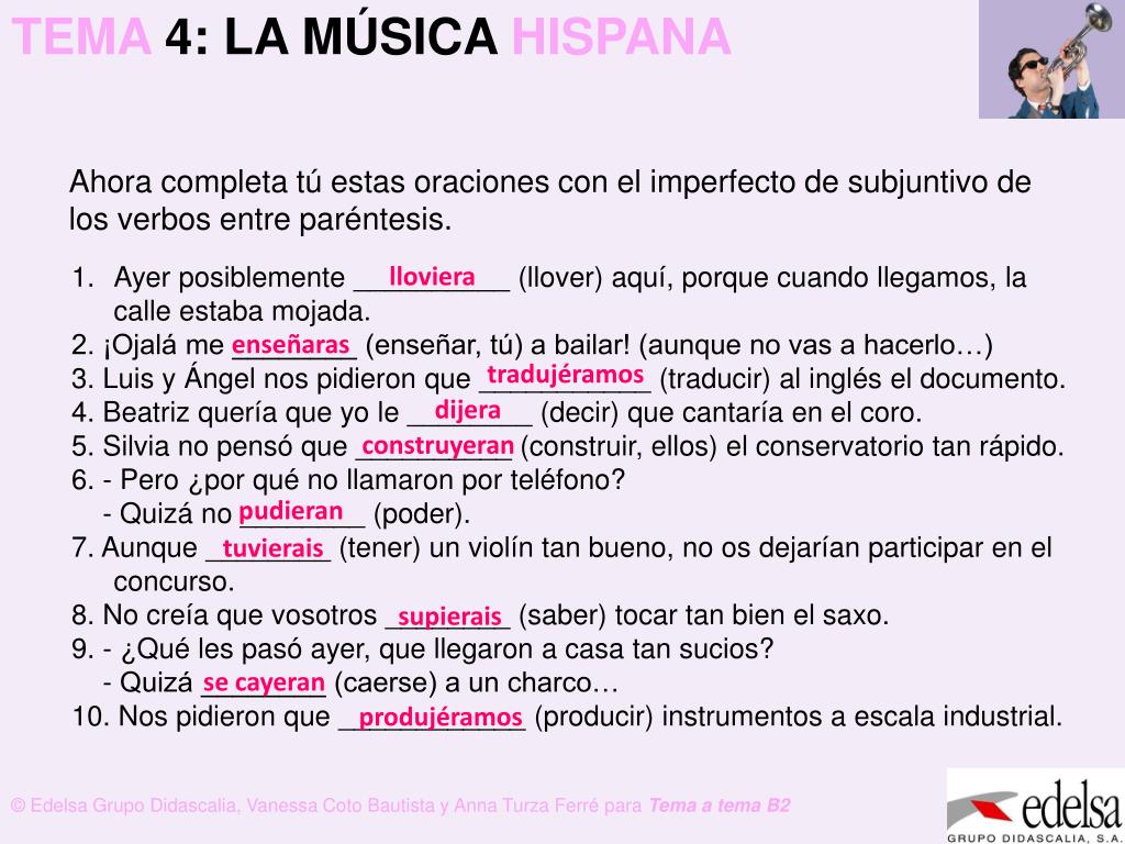 Ahora completa tú estas oraciones con el imperfecto de subjuntivo de los verbos entre paréntesis. • Ayer posiblemente __________ (llover) aquí, porque cuando llegamos, la calle estaba mojada. • 2. ¡Ojalá me ________ (enseñar, tú) a bailar! (aunque no vas a hacerlo…) • 3. Luis y Ángel nos pidieron que ___________ (traducir) al inglés el documento. • 4. Beatriz quería que yo le ________ (decir) que cantaría en el coro. • 5. Silvia no pensó que __________ (construir, ellos) el conservatorio tan rápido. • 6. - Pero ¿por qué no llamaron por teléfono? • - Quizá no ________ (poder). • 7. Aunque ________ (tener) un violín tan bueno, no os dejarían participar en el concurso. • 8. No creía que vosotros ________ (saber) tocar tan bien el saxo. • 9. - ¿Qué les pasó ayer, que llegaron a casa tan sucios? • - Quizá ________ (caerse) a un charco… • 10. Nos pidieron que ____________ (producir) instrumentos a escala industrial. lloviera enseñaras tradujéramos dijera construyeran pudieran tuvierais supierais se cayeran produjéramos