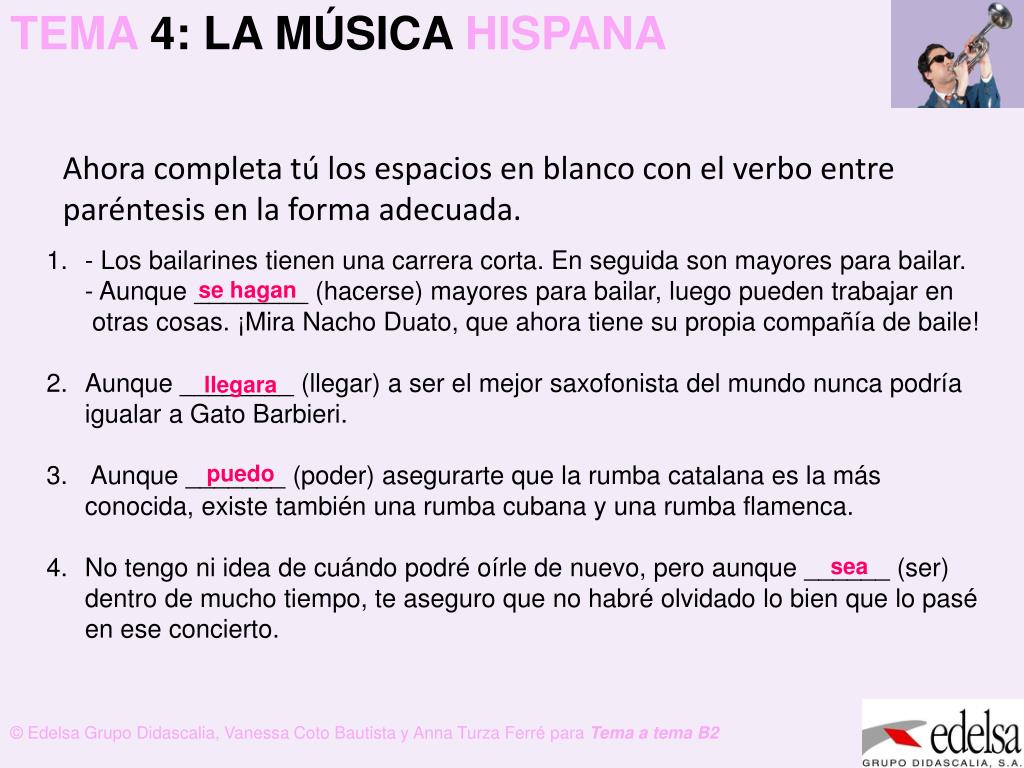 Ahora completa tú los espacios en blanco con el verbo entre paréntesis en la forma adecuada. • - Los bailarines tienen una carrera corta. En seguida son mayores para bailar. • - Aunque ________ (hacerse) mayores para bailar, luego pueden trabajar en • otras cosas. ¡Mira Nacho Duato, que ahora tiene su propia compañía de baile! • Aunque ________ (llegar) a ser el mejor saxofonista del mundo nunca podría igualar a Gato Barbieri. • Aunque _______ (poder) asegurarte que la rumba catalana es la más conocida, existe también una rumba cubana y una rumba flamenca. • No tengo ni idea de cuándo podré oírle de nuevo, pero aunque ______ (ser) dentro de mucho tiempo, te aseguro que no habré olvidado lo bien que lo pasé en ese concierto. se hagan llegara puedo sea