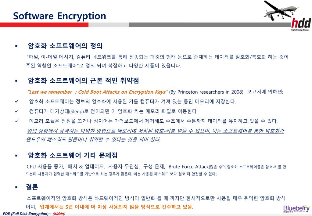 Software Encryption • 암호화 소프트웨어의 정의 • “파일, 이-메일 메시지, 컴퓨터 네트워크를 통해 전송되는 패킷의 형태 등으로 존재하는 데이터를 암호화/복호화 하는 것이 주된 역할인 소프트웨어”로 정의 되며 복잡하고 다양한 제품이 있읍니다. • 암호화 소프트웨어의 근본 적인 취약점 • “Lest we remember : Cold Boot Attacks on Encryption Keys” (By Princeton researchers in 2008) 보고서에 의하면: • 암호화 소프트웨어는 정보의 암호화에 사용된 키를 컴퓨터가 켜져 있는 동안 메모리에 저장한다. • 컴퓨터가 대기상태(Sleep)로 전이되면 이 암호화-키는 메모리 파일로 이동한다 • 메모리 모듈은 전원을 끄거나 심지어는 마더보드에서 제거해도 수초에서 수분까지 데이터를 유지하고 있을 수 있다. • 위의 상황에서 공격자는 다양한 방법으로 메모리에 저장된 암호-키를 얻을 수 있으며, 이는 소프트웨어를 통한 암호화가 윈도우의 패스워드 만큼이나 취약할 수 있다는 것을 의미 한다. • 암호화 소프트웨어 기타 문제점 • CPU 사용률 증가, 패치 & 업데이트, 사용자 무관심, 구성 문제, Brute Force Attack(많은 수의 암호화 소프트웨어들은 암호-키를 만드는데 사용자가 입력한 패스워드를 기반으로 하는 경우가 많은데, 이는 사용된 패스워드 보다 결코 더 안전할 수 없다.) • 결론 • 소프트웨어적인 암호화 방식은 하드웨어적인 방식이 일반화 될 때 까지만 한시적으로만 사용될 매우 취약한 암호화 방식이며, 업계에서는 5년 이내에 더 이상 사용되지 않을 방식으로 간주하고 있음.