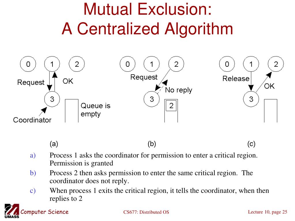 Mutual Exclusion: A Centralized Algorithm • Process 1 asks the coordinator for permission to enter a critical region. Permission is granted • Process 2 then asks permission to enter the same critical region. The coordinator does not reply. • When process 1 exits the critical region, it tells the coordinator, when then replies to 2 CS677: Distributed OS