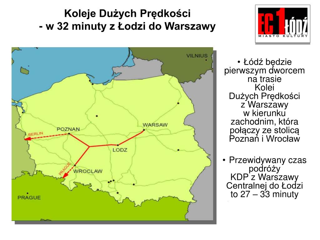 Koleje Dużych Prędkości - w 32 minuty z Łodzi do Warszawy • Łódź będzie pierwszym dworcem na trasie Kolei Dużych Prędkości z Warszawy w kierunku zachodnim, która połączy ze stolicą Poznań i Wrocław • Przewidywany czas podróży KDP z Warszawy Centralnej do Łodzi to 27 – 33 minuty • .