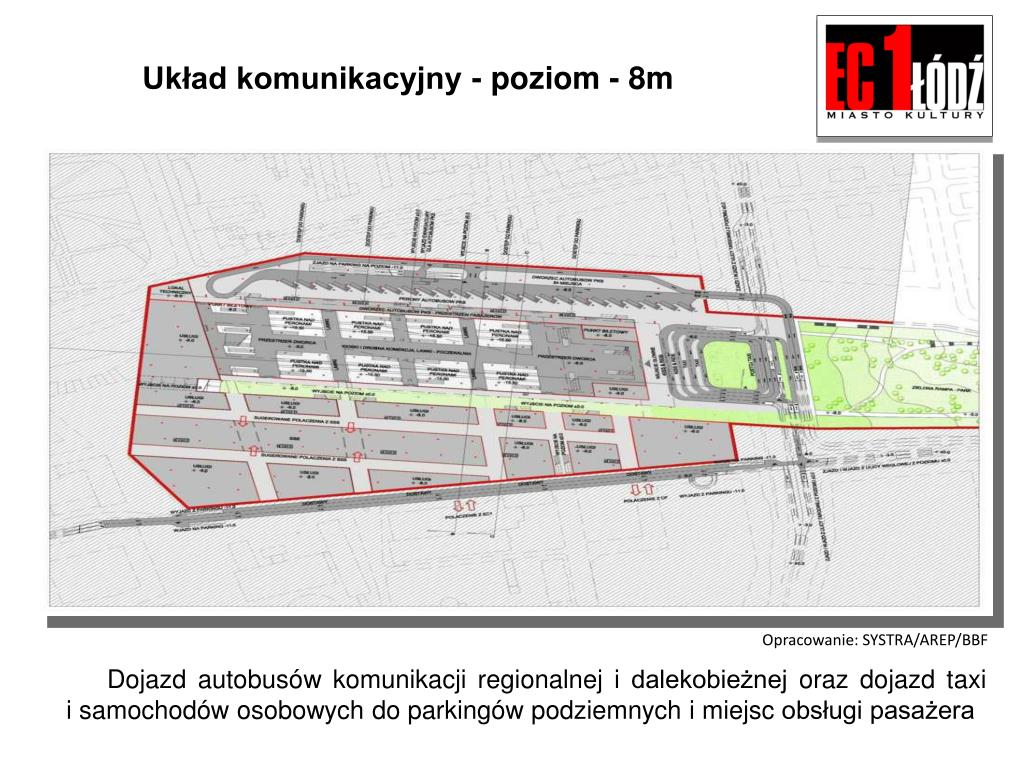 Układ komunikacyjny - poziom - 8m Opracowanie: SYSTRA/AREP/BBF Dojazd autobusów komunikacji regionalnej i dalekobieżnej oraz dojazd taxi i samochodów osobowych do parkingów podziemnych i miejsc obsługi pasażera