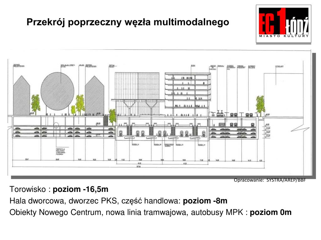 Przekrój poprzeczny węzła multimodalnego Opracowanie: SYSTRA/AREP/BBF Torowisko : poziom -16,5m Hala dworcowa, dworzec PKS, część handlowa: poziom -8m Obiekty Nowego Centrum, nowa linia tramwajowa, autobusy MPK : poziom 0m
