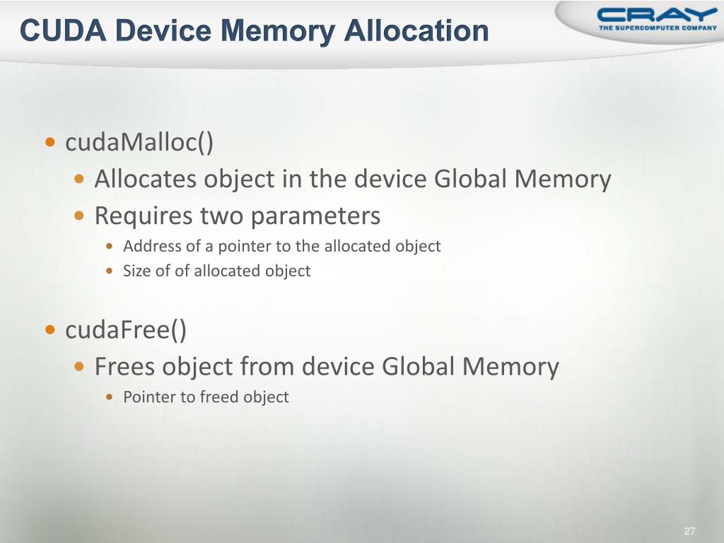 CUDA Device Memory Allocation • cudaMalloc() • Allocates object in the device Global Memory • Requires two parameters • Address of a pointer to the allocated object • Size of of allocated object • cudaFree() • Frees object from device Global Memory • Pointer to freed object