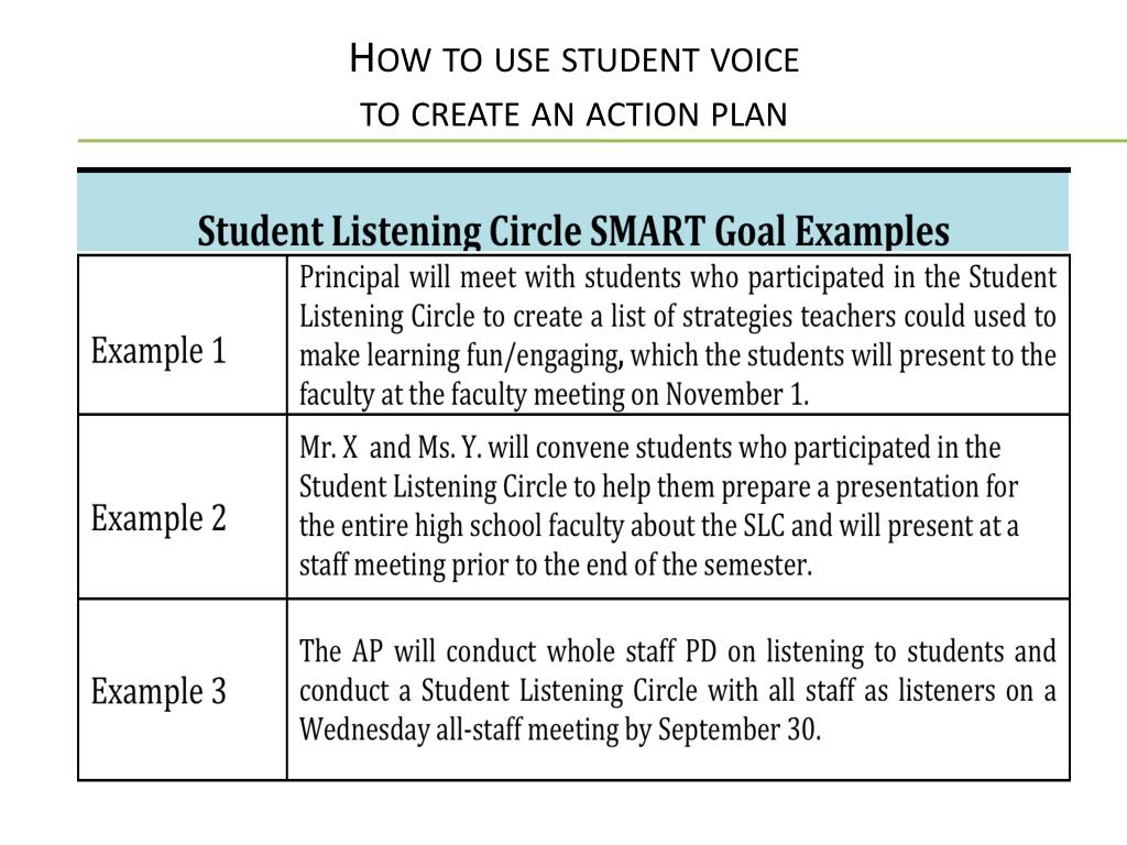 Adult Agreements for the SLC • Turn off cell phones and refrain from texting. • Stay for the entire listening circle. • Be silent during the student voice (response) portion, i.e. listen attentively. • Commit to a plan of action that reflects the students’ perspectives.