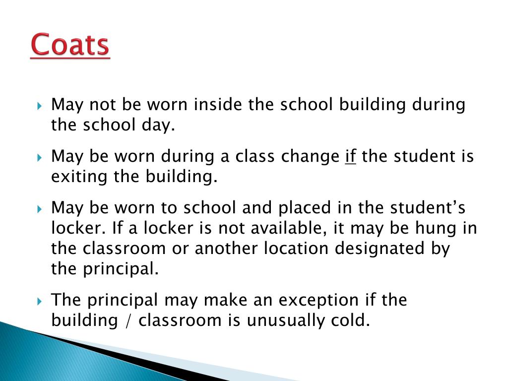 Coats • May not be worn inside the school building during the school day. • May be worn during a class change if the student is exiting the building. • May be worn to school and placed in the student’s locker. If a locker is not available, it may be hung in the classroom or another location designated by the principal. • The principal may make an exception if the building / classroom is unusually cold.