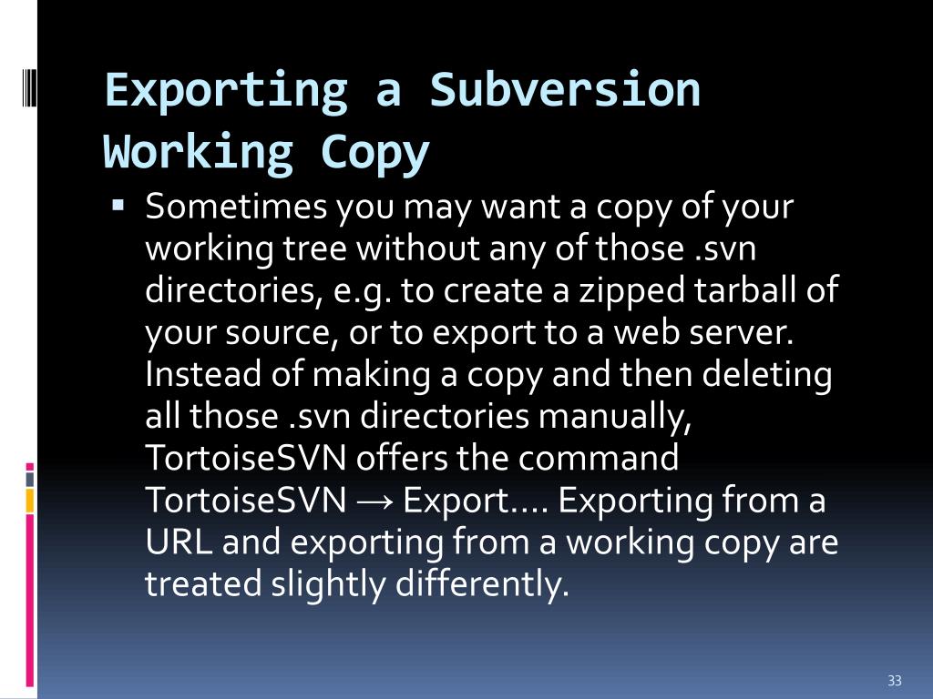 Exporting a Subversion Working Copy • Sometimes you may want a copy of your working tree without any of those .svn directories, e.g. to create a zipped tarball of your source, or to export to a web server. Instead of making a copy and then deleting all those .svn directories manually, TortoiseSVN offers the command TortoiseSVN → Export.... Exporting from a URL and exporting from a working copy are treated slightly differently.