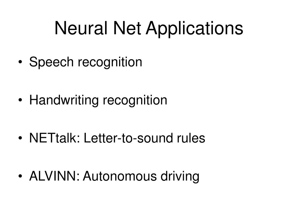 Neural Net Applications • Speech recognition • Handwriting recognition • NETtalk: Letter-to-sound rules • ALVINN: Autonomous driving
