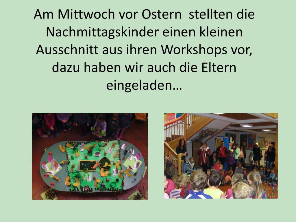 Am Mittwoch vor Ostern stellten die Nachmittagskinder einen kleinen Ausschnitt aus ihren Workshops vor, dazu haben wir auch die Eltern eingeladen…