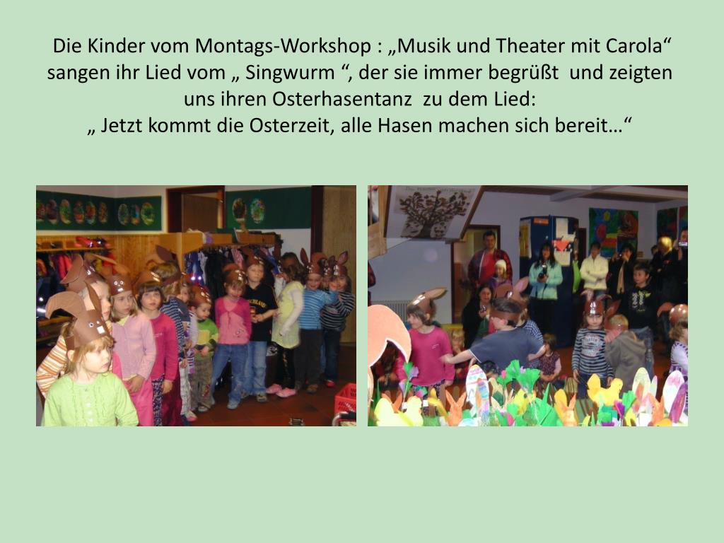 Die Kinder vom Montags-Workshop : „Musik und Theater mit Carola“ sangen ihr Lied vom „ Singwurm “, der sie immer begrüßt und zeigten uns ihren Osterhasentanz zu dem Lied:„ Jetzt kommt die Osterzeit, alle Hasen machen sich bereit…“