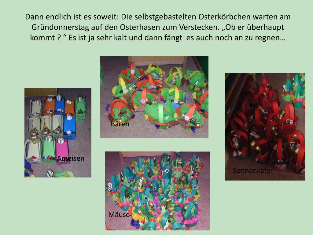 Dann endlich ist es soweit: Die selbstgebastelten Osterkörbchen warten am Gründonnerstag auf den Osterhasen zum Verstecken. „Ob er überhaupt kommt ? “ Es ist ja sehr kalt und dann fängt es auch noch an zu regnen… Bären Ameisen Sonnenkäfer Mäuse