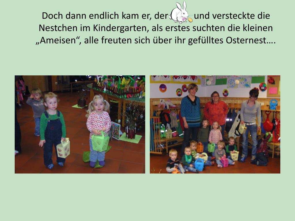 Doch dann endlich kam er, der und versteckte die Nestchen im Kindergarten, als erstes suchten die kleinen „Ameisen“, alle freuten sich über ihr gefülltes Osternest….