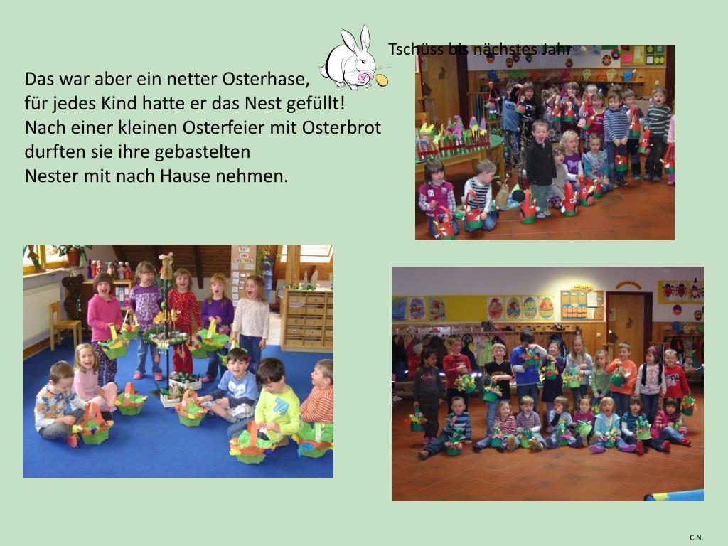 Tschüss bis nächstes Jahr Das war aber ein netter Osterhase, für jedes Kind hatte er das Nest gefüllt! Nach einer kleinen Osterfeier mit Osterbrot durften sie ihre gebastelten Nester mit nach Hause nehmen. C.N.