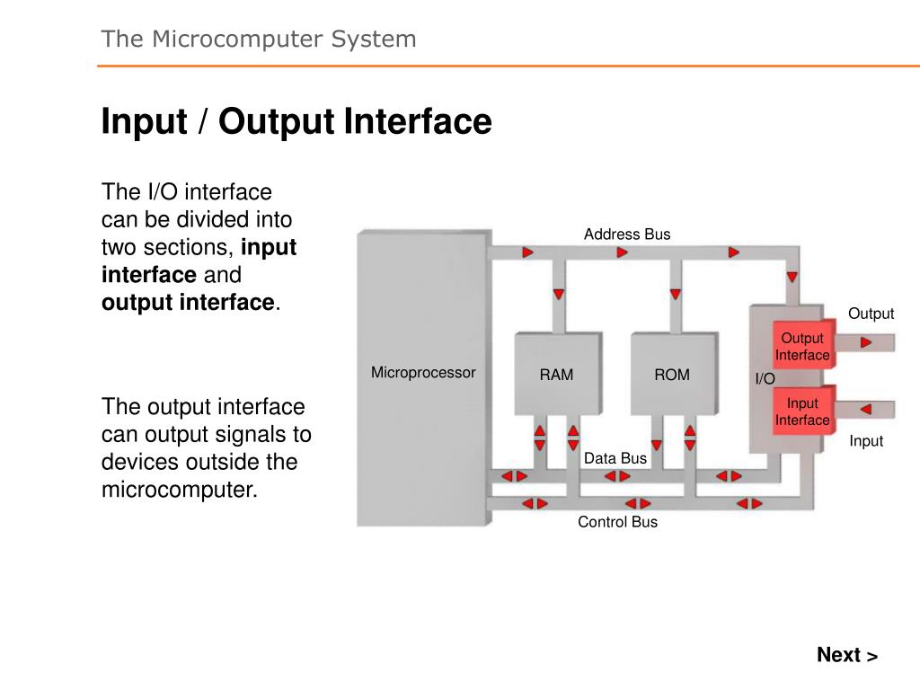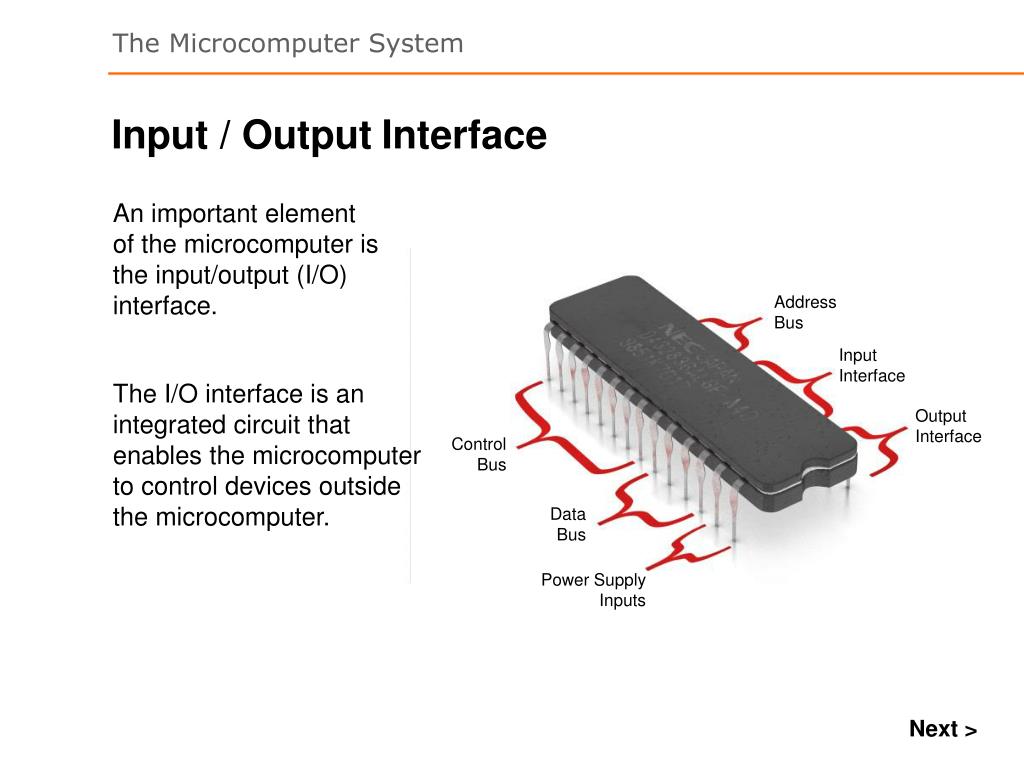 Address Bus Address Bus Input Interface Output Input / output Interface Output Interface Microprocessor RAM ROM Control Bus Input Data Bus Data Bus Power Supply Inputs Control Bus Input / OutputInterface An important element of the microcomputer is the input/output (I/O) interface. The I/O interface is an integrated circuit that enables the microcomputer to control devices outside the microcomputer. Next >