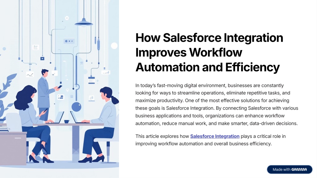 How Salesforce Integration Improves Workflow Automation and Efficiency In today¾s fast-moving digital environment, businesses are constantly looking for ways to streamline operations, eliminate repetitive tasks, and maximize productivity. One of the most effective solutions for achieving these goals is Salesforce Integration. By connecting Salesforce with various business applications and tools, organizations can enhance workflow automation, reduce manual work, and make smarter, data-driven decisions. This article explores how Salesforce Integration plays a critical role in improving workflow automation and overall business efficiency.