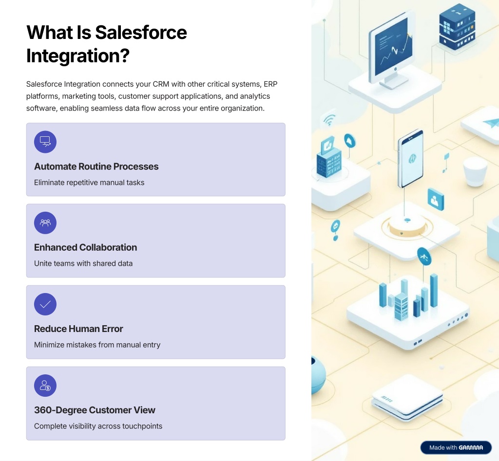 What Is Salesforce Integration? Salesforce Integration connects your CRM with other critical systems, ERP platforms, marketing tools, customer support applications, and analytics software, enabling seamless data flow across your entire organization. Automate Routine Processes Eliminate repetitive manual tasks Enhanced Collaboration Unite teams with shared data Reduce Human Error Minimize mistakes from manual entry 360-Degree Customer View Complete visibility across touchpoints