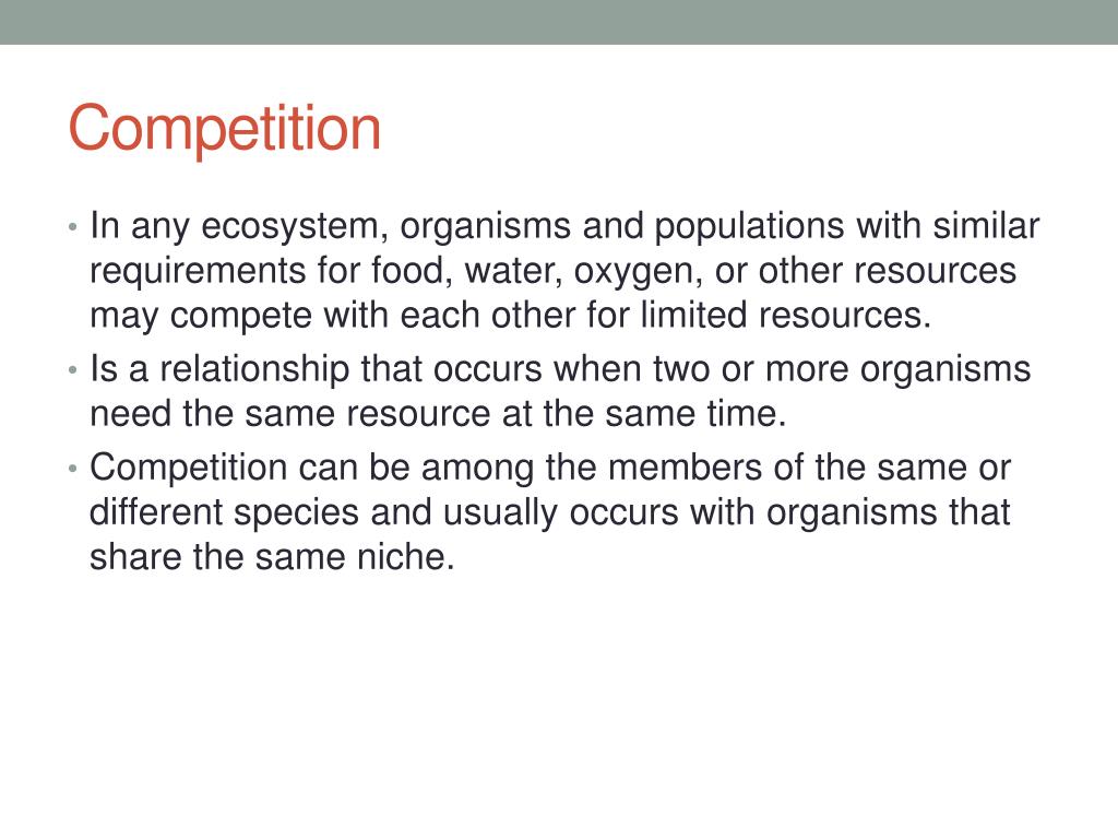 Competition • In any ecosystem, organisms and populations with similar requirements for food, water, oxygen, or other resources may compete with each other for limited resources. • Is a relationship that occurs when two or more organisms need the same resource at the same time. • Competition can be among the members of the same or different species and usually occurs with organisms that share the same niche.