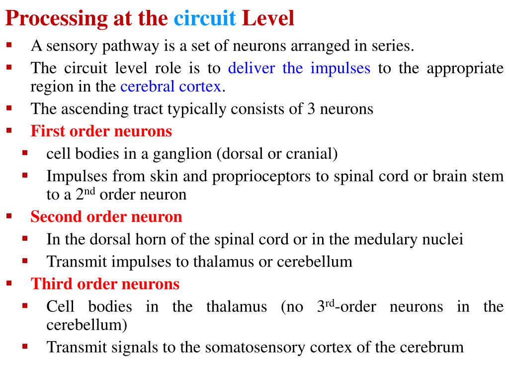Processing at the circuit Level • A sensory pathway is a set of neurons arranged in series. • The circuit level role is to deliver the impulses to the appropriate region in the cerebral cortex. • The ascending tract typically consists of 3 neurons • First order neurons • cell bodies in a ganglion (dorsal or cranial) • Impulses from skin and proprioceptors to spinal cord or brain stem to a 2nd order neuron • Second order neuron • In the dorsal horn of the spinal cord or in the medulary nuclei • Transmit impulses to thalamus or cerebellum • Third order neurons • Cell bodies in the thalamus (no 3rd-order neurons in the cerebellum) • Transmit signals to the somatosensory cortex of the cerebrum
