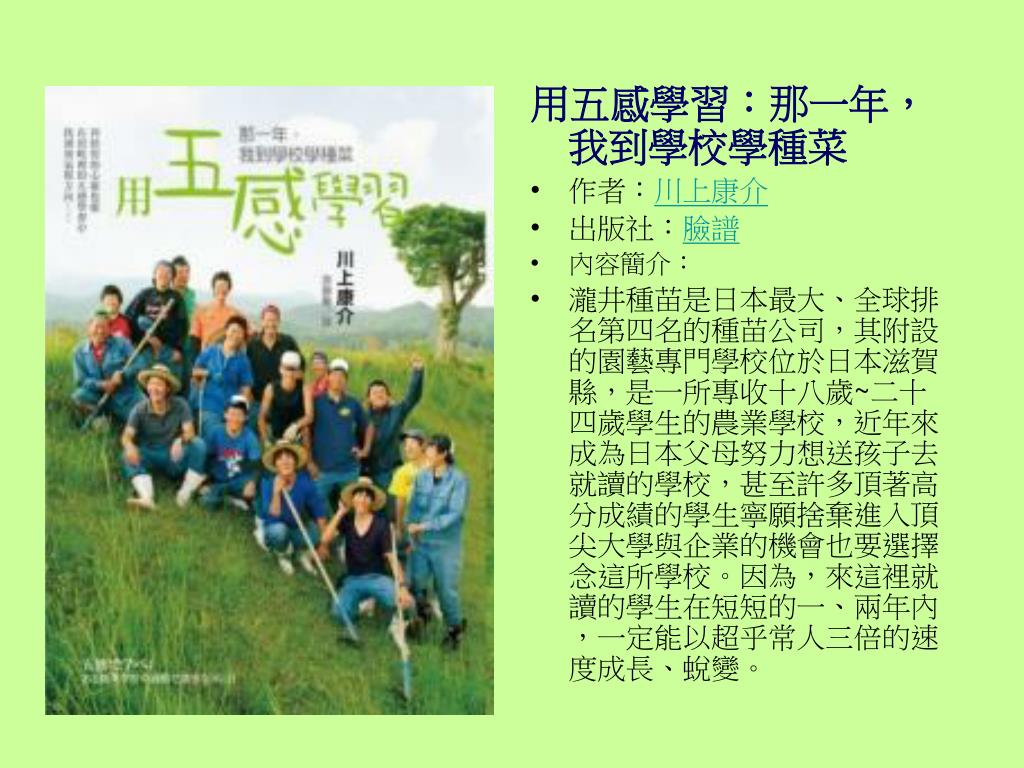 用五感學習:那一年,我到學校學種菜 作者:川上康介 出版社:臉譜 內容簡介: 瀧井種苗是日本最大、全球排名第四名的種苗公司,其附設的園藝專門學校位於日本滋賀縣,是一所專收十八歲~二十四歲學生的農業學校,近年來成為日本父母努力想送孩子去就讀的學校,甚至許多頂著高分成績的學生寧願捨棄進入頂尖大學與企業的機會也要選擇念這所學校。因為,來這裡就讀的學生在短短的一、兩年內,一定能以超乎常人三倍的速度成長、蛻變。