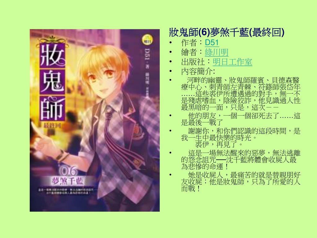 妝鬼師(6)夢煞千藍(最終回) • 作者:D51 • 繪者:綠川明 • 出版社:明日工作室 • 內容簡介: • 河畔的幽靈、妝鬼師羅賓、貝德森醫療中心、刺青師左青棘、符籙師張岱年……這些裘伊所遭遇過的對手,無一不是殘虐嗜血,陰險狡詐,他見識過人性最黑暗的一面,只是,這次-- • 他的朋友,一個一個卻死去了……這是最後一戰了 • 謝謝你,和你們認識的這段時間,是我一生中最快樂的時光。 裘伊,再見了。 • 這是一場無法醒來的惡夢,無法逃離的怨念詛咒──沈千藍將體會收屍人最為悲慘的命運! • 她是收屍人,最痛苦的就是替親朋好友收屍;他是妝鬼師,只為了所愛的人而戰!