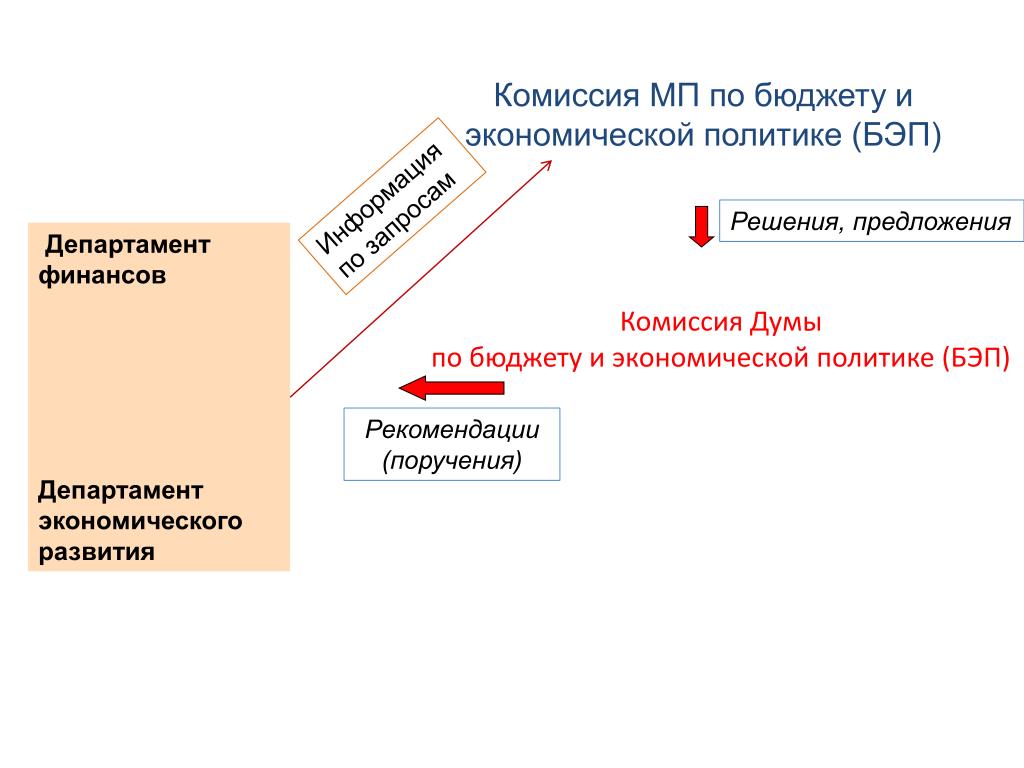 Комиссия МП по бюджету и экономической политике (БЭП) Комиссия Думы по бюджету и экономической политике (БЭП) Информация по запросам Решения, предложения Департамент финансов Департамент экономического развития Рекомендации (поручения)