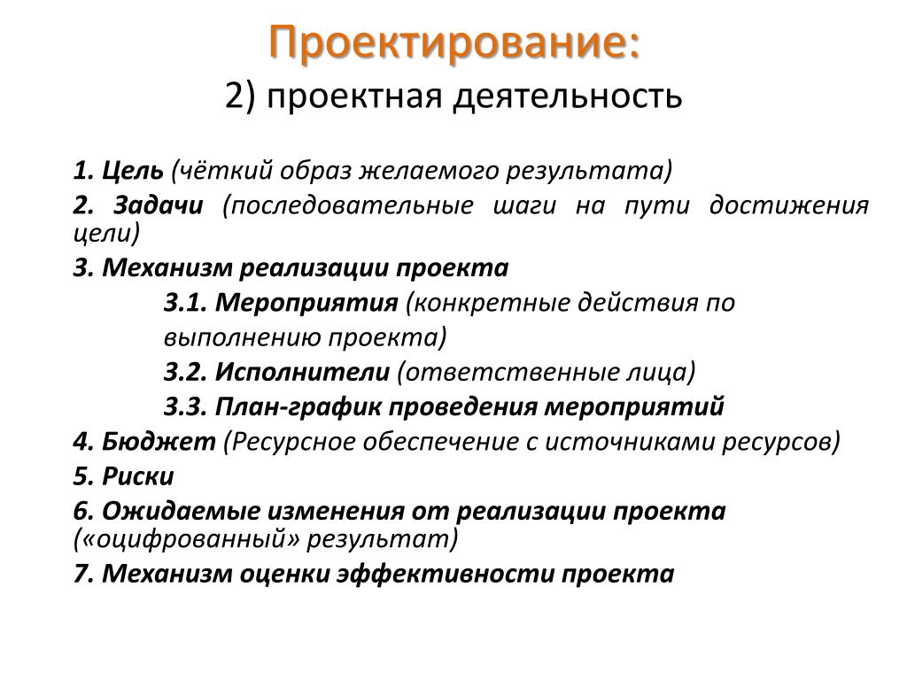 Проектирование:2) проектная деятельность 1. Цель (чёткий образ желаемого результата) 2. Задачи (последовательные шаги на пути достижения цели) 3. Механизм реализации проекта 3.1. Мероприятия (конкретные действия по выполнению проекта) 3.2. Исполнители (ответственные лица) 3.3. План-график проведения мероприятий 4. Бюджет (Ресурсное обеспечение с источниками ресурсов) 5.Риски 6. Ожидаемые изменения от реализации проекта («оцифрованный» результат) 7. Механизм оценки эффективности проекта