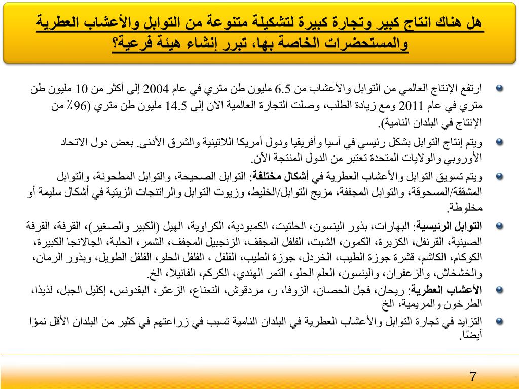 هل هناك انتاج كبير وتجارة كبيرة لتشكيلة متنوعة من التوابل والأعشاب العطرية والمستحضرات الخاصة بها، تبرر إنشاء هيئة فرعية؟ Jodhpur • ارتفع الإنتاج العالمي من التوابل والأعشاب من 6.5 مليون طن متري في عام 2004 إلى أكثر من 10 مليون طن متري في عام 2011 ومع زيادة الطلب، وصلت التجارة العالمية الآن إلى 4.51مليون طن متري (96٪ من الإنتاج في البلدان النامية). • ويتم إنتاج التوابل بشكل رئيسي في آسيا وأفريقيا ودول أمريكا اللاتينية والشرق الأدنى. بعض دول الاتحاد الأوروبي والولايات المتحدة تعتبر من الدول المنتجة الآن. • ويتم تسويق التوابل والأعشاب العطرية في أشكال مختلفة: التوابل الصحيحة، والتوابلالمطحونة، والتوابل المشققة/المسحوقة، والتوابل المجففة، مزيج التوابل/الخليط، وزيوت التوابل والراتنجات الزيتية في أشكال سليمةأو مخلوطة. • التوابل الرئيسية: البهارات،بذور الينسون، الحلتيت، الكمبودية، الكراوية، الهيل (الكبير والصغير)، القرفة، القرفة الصينية، القرنفل، الكزبرة، الكمون، الشبت، الفلفل المجفف، الزنجبيل المجفف، الشمر، الحلبة، الجالانجا الكبيرة، الكوكام، الكاشم، قشرة جوزة الطيب، الخردل، جوزة الطيب، الفلفل ، الفلفل الحلو، الفلفل الطويل، وبذور الرمان، والخشخاش، والزعفران، والينسون، العلم الحلو، التمر الهندي، الكركم، الفانيلا، الخ. • الأعشاب العطرية: ريحان، فجل الحصان، الزوفا، ر، مردقوش، النعناع، الزعتر، البقدونس، إكليل الجبل، لذيذا، الطرخونوالمريمية، الخ • التزايد في تجارة التوابل والأعشاب العطرية في البلدان النامية تسبب فيزراعتهم في كثير من البلدان الأقل نموًا أيضًا. 7