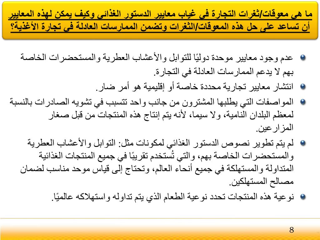 ما هي معوقات/ثغرات التجارة في غياب معايير الدستور الغذائي وكيف يمكن لهذه المعايير أن تساعد على حل هذه المعوقات/الثغرات وتضمن الممارسات العادلة في تجارة الأغذية؟ Jodhpur • عدم وجود معايير موحدة دوليًا للتوابل والأعشاب العطرية والمستحضرات الخاصة بهم لا يدعم الممارسات العادلة في التجارة. • انتشار معايير تجارية محددة خاصة أو إقليمية هو أمر ضار. • المواصفات التي يطلبهاالمشترون من جانب واحدتتسبب في تشويه الصادرات بالنسبة لمعظم البلدان النامية، ولا سيما، لأنه يتم إنتاج هذه المنتجات من قبل صغار المزارعين. • لم يتم تطوير نصوص الدستور الغذائي لمكونات مثل:التوابل والأعشاب العطرية والمستحضرات الخاصة بهم، والتي تُستخدم تقريبًا في جميع المنتجات الغذائية المتداولة والمستهلكة في جميع أنحاء العالم، وتحتاج إلى قياس موحد مناسب لضمان مصالح المستهلكين. • نوعية هذه المنتجات تحدد نوعية الطعام الذي يتم تداوله واستهلاكه عالميًا. 8
