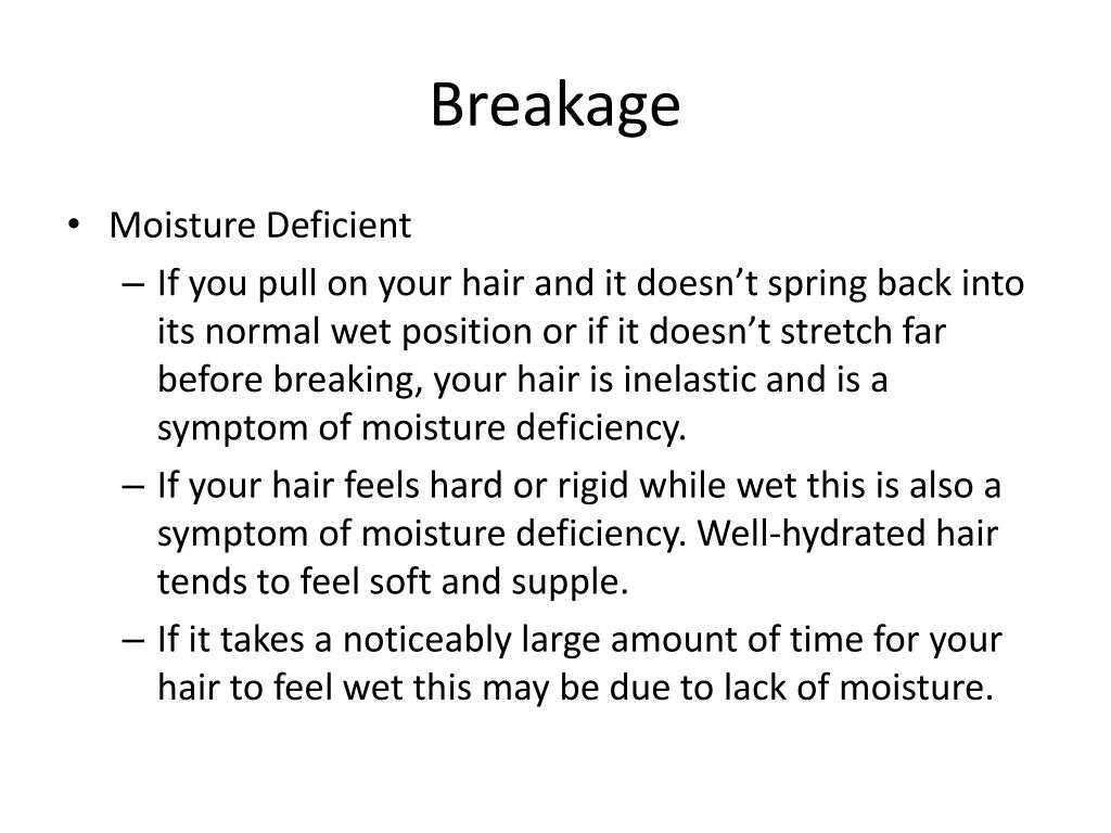 Breakage • Moisture Deficient • If you pull on your hair and it doesn’t spring back into its normal wet position or if it doesn’t stretch far before breaking, your hair is inelastic and is a symptom of moisture deficiency. • If your hair feels hard or rigid while wet this is also a symptom of moisture deficiency. Well-hydrated hair tends to feel soft and supple. • If it takes a noticeably large amount of time for your hair to feel wet this may be due to lack of moisture.