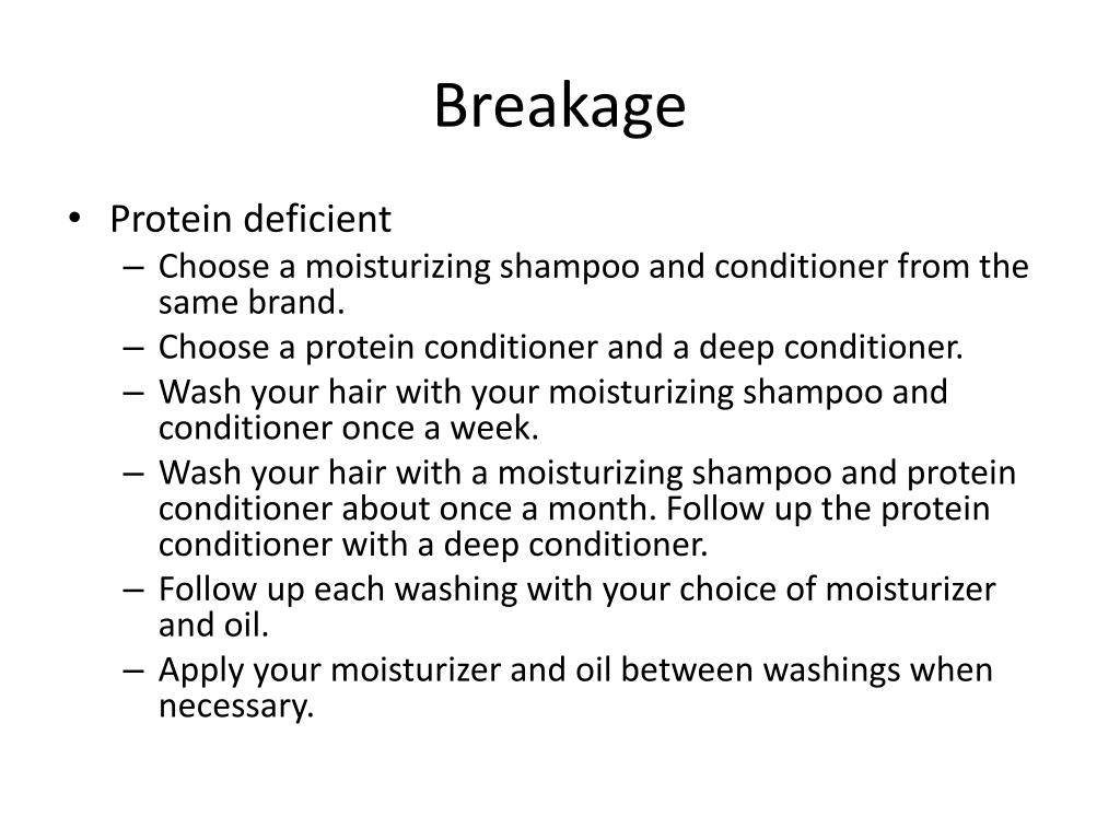 Breakage • How do I fix it? • Protein Deficient- Using either a protein conditioner or protein treatment may be necessary about once a month. Follow up a protein conditioner or protein treatment with a deep conditioner. When not using a protein conditioner, use a moisturizing conditioner. These time periods are flexible and may vary for each person.