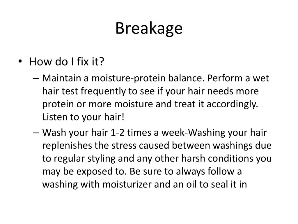 Breakage • How do I fix it? • Maintain a moisture-protein balance. Perform a wet hair test frequently to see if your hair needs more protein or more moisture and treat it accordingly. Listen to your hair! • Wash your hair 1-2 times a week-Washing your hair replenishes the stress caused between washings due to regular styling and any other harsh conditions you may be exposed to. Be sure to always follow a washing with moisturizer and an oil to seal it in