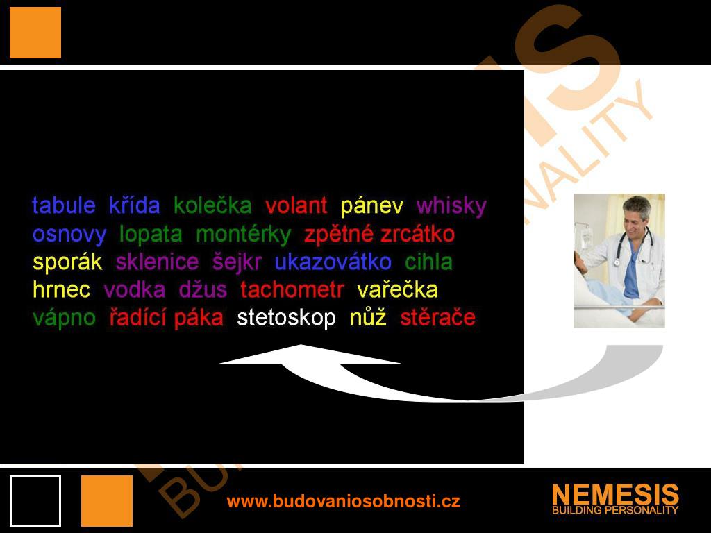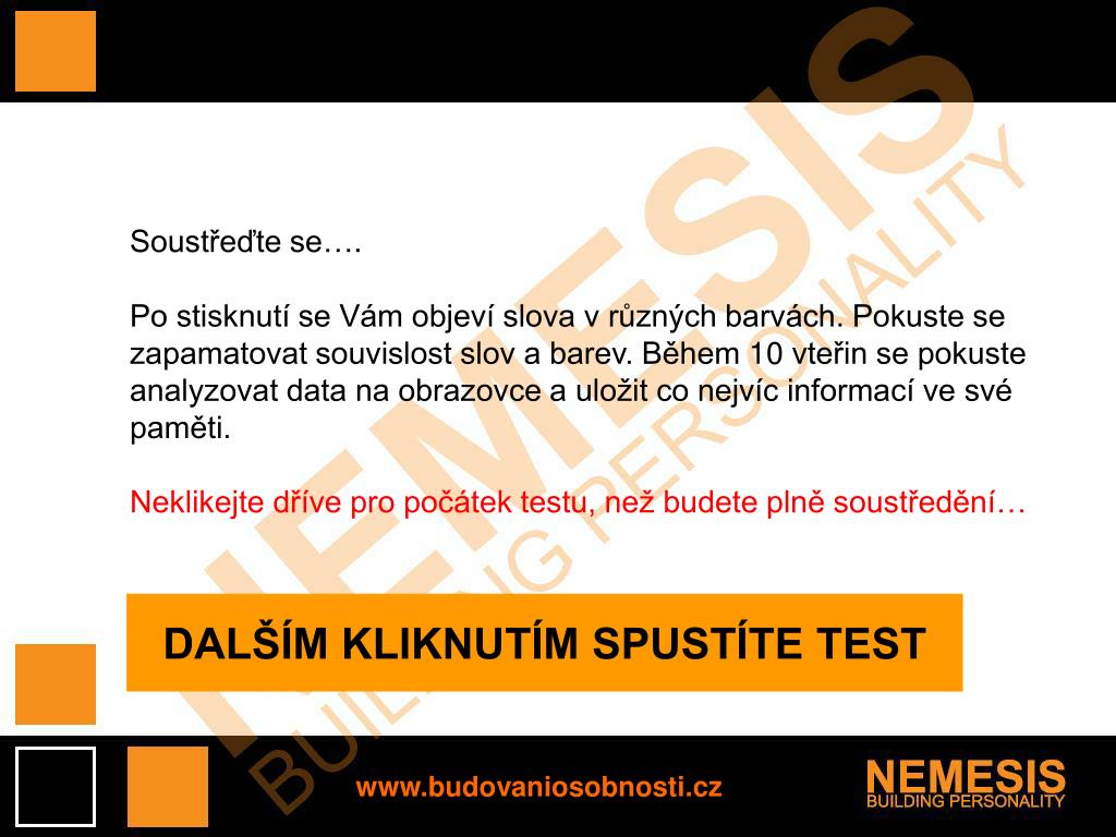 Soustřeďte se…. Po stisknutí se Vám objeví slova v různých barvách. Pokuste se zapamatovat souvislost slov a barev. Během 10 vteřin se pokuste analyzovat data na obrazovce a uložit co nejvíc informací ve své paměti. Neklikejte dříve pro počátek testu, než budete plně soustředění… DALŠÍM KLIKNUTÍM SPUSTÍTE TEST www.budovaniosobnosti.cz