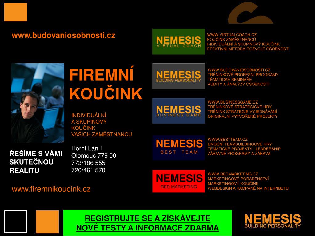 www.budovaniosobnosti.cz WWW.VIRTUALCOACH.CZ KOUČINK ZAMĚSTNANCŮ INDIVIDUÁLNÍ A SKUPINOVÝ KOUČINK EFEKTIVNÍ METODA ROZVOJE OSOBNOSTI FIREMNÍ KOUČINK WWW.BUDOVANIOSOBNOSTI.CZ TRÉNINKOVÉ PROFESNÍ PROGRAMY TÉMATICKÉ SEMINÁŘE AUDITY A ANALÝZY OSOBNOSTI WWW.BUSINESSGAME.CZ TRÉNINKOVÉ STRATEGICKÉ HRY TRÉNINK STRATEGIE VYJEDNÁVÁNÍ ORIGINÁLNÍ VYTVOŘENÉ PROJEKTY INDIVIDUÁLNÍ A SKUPINOVÝ KOUČINK VAŠICH ZAMĚSTNANCŮ NEMESIS WWW.BESTTEAM.CZ EMOČNÍ TEAMBUILDINGOVÉ HRY TÉMATICKÉ PROJEKTY - LEADERSHIP ZÁBAVNÉ PROGRAMY A ZÁBAVA Horní Lán 1 Olomouc 779 00 773/186 555 720/461 570 ŘEŠÍME S VÁMI SKUTEČNOU REALITU B E S T T E A M NEMESIS WWW.REDMARKETING.CZ MARKETINGOVÉ PORADENSTVÍ MARKETINGOVÝ KOUČINK WEBDESIGN A KAMPANĚ NA INTERNBETU www.firemnikoucink.cz RED MARKETING REGISTRUJTE SE A ZÍSKÁVEJTE NOVÉ TESTY A INFORMACE ZDARMA