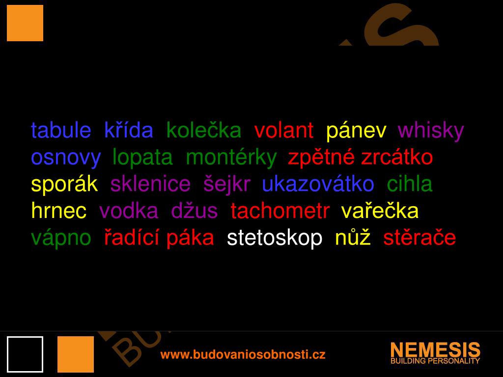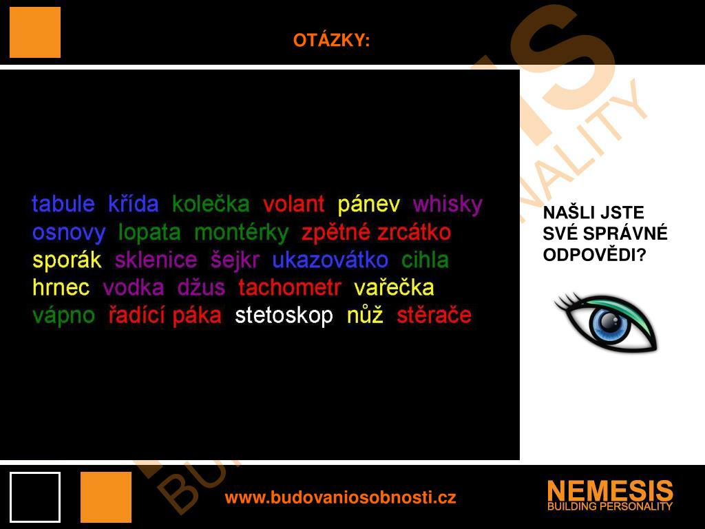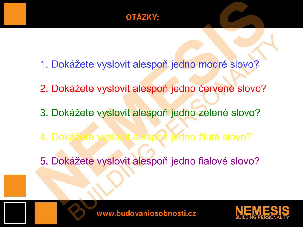 OTÁZKY: • Dokážete vyslovit alespoň jedno modré slovo? • Dokážete vyslovit alespoň jedno červené slovo? • Dokážete vyslovit alespoň jedno zelené slovo? • Dokážete vyslovit alespoň jedno žluté slovo? • Dokážete vyslovit alespoň jedno fialové slovo? www.budovaniosobnosti.cz