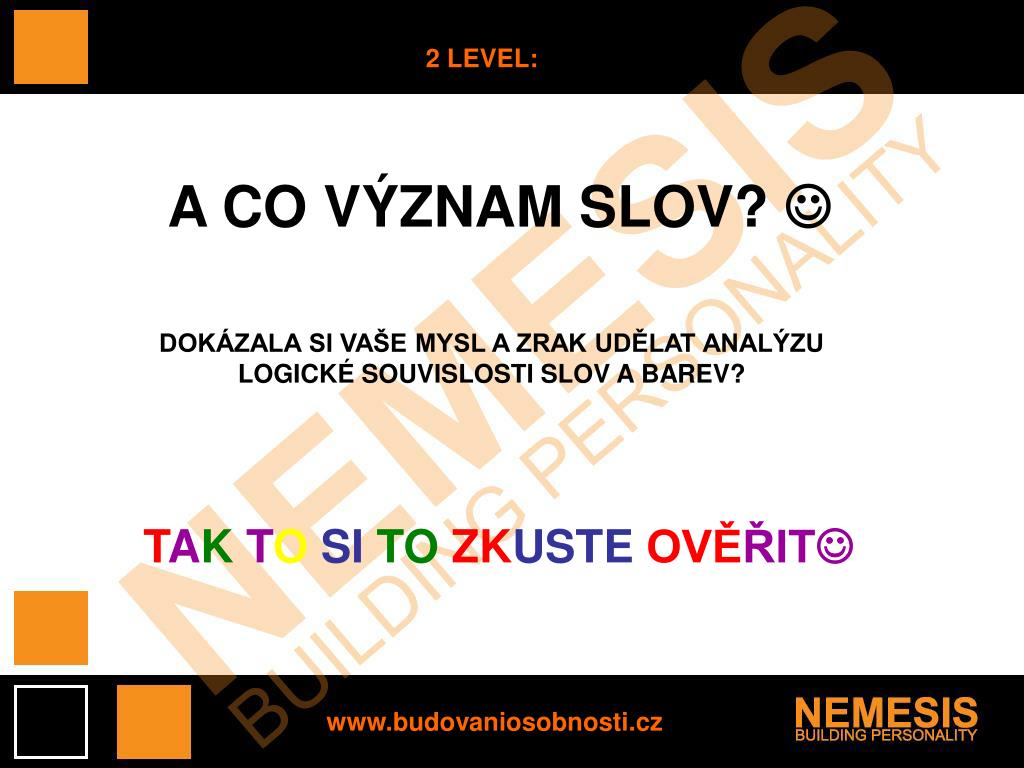 2 LEVEL: A CO VÝZNAM SLOV? DOKÁZALA SI VAŠE MYSL A ZRAK UDĚLAT ANALÝZU LOGICKÉ SOUVISLOSTI SLOV A BAREV? TAK TOSITOZKUSTEOVĚŘIT www.budovaniosobnosti.cz