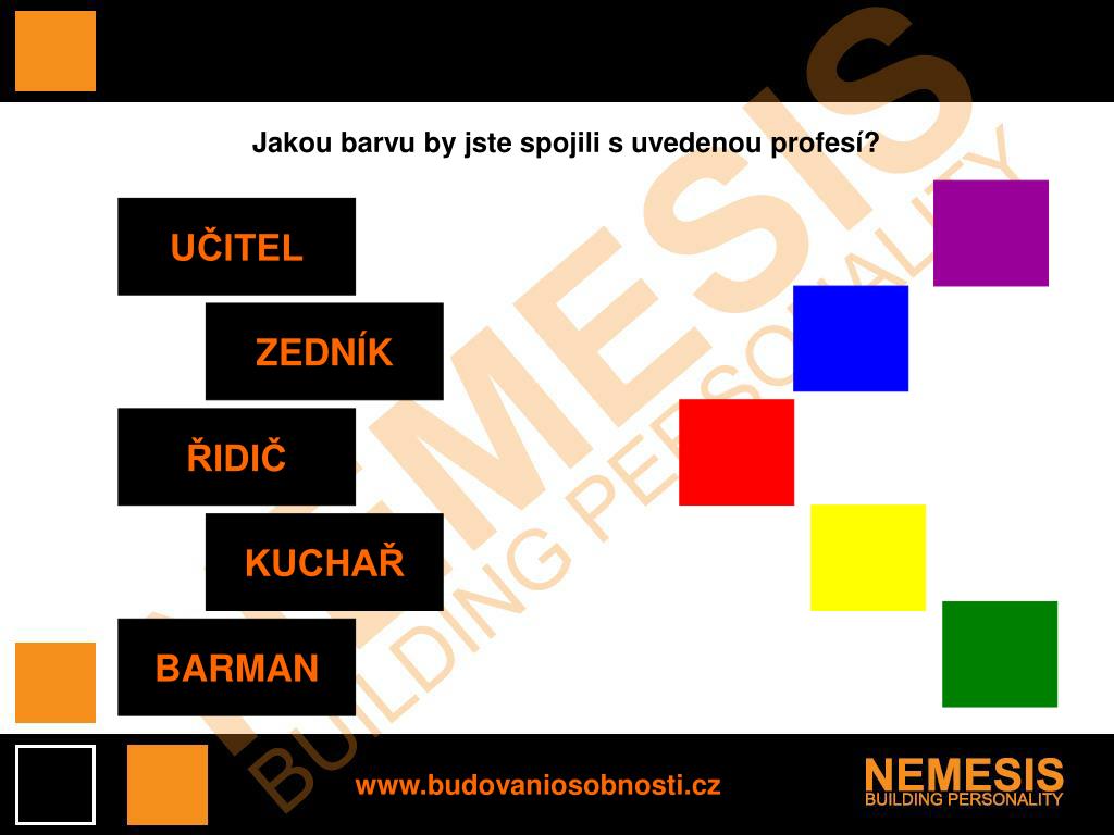 Jakou barvu by jste spojili s uvedenou profesí? UČITEL ZEDNÍK ŘIDIČ KUCHAŘ BARMAN www.budovaniosobnosti.cz
