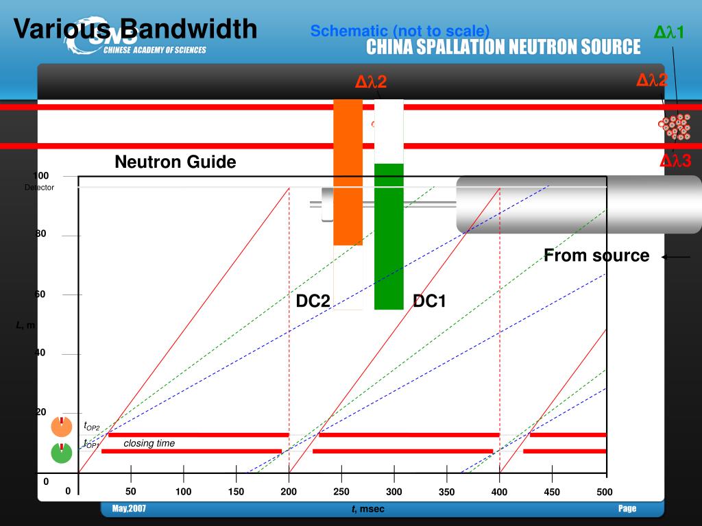 Δ1 Δ2 Δ2 100 Detector Δ3 80 60 L, m tOP2 40 tOP1 closing time 50 20 0 0 100 150 200 250 300 350 400 450 500 t, msec Various Bandwidth Schematic (not to scale) Neutron Guide From source DC2 DC1