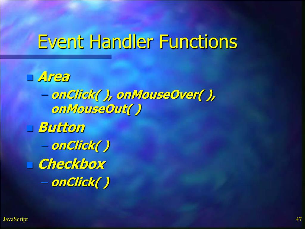 Event Handler Functions • Area • onClick( ), onMouseOver( ), onMouseOut( ) • Button • onClick( ) • Checkbox • onClick( ) JavaScript