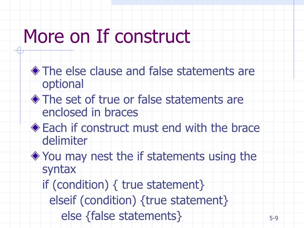 More on If construct • The else clause and false statements are optional • The set of true or false statements are enclosed in braces • Each if construct must end with the brace delimiter • You may nest the if statements using the syntax if (condition) { true statement} elseif (condition) {true statement} else {false statements}