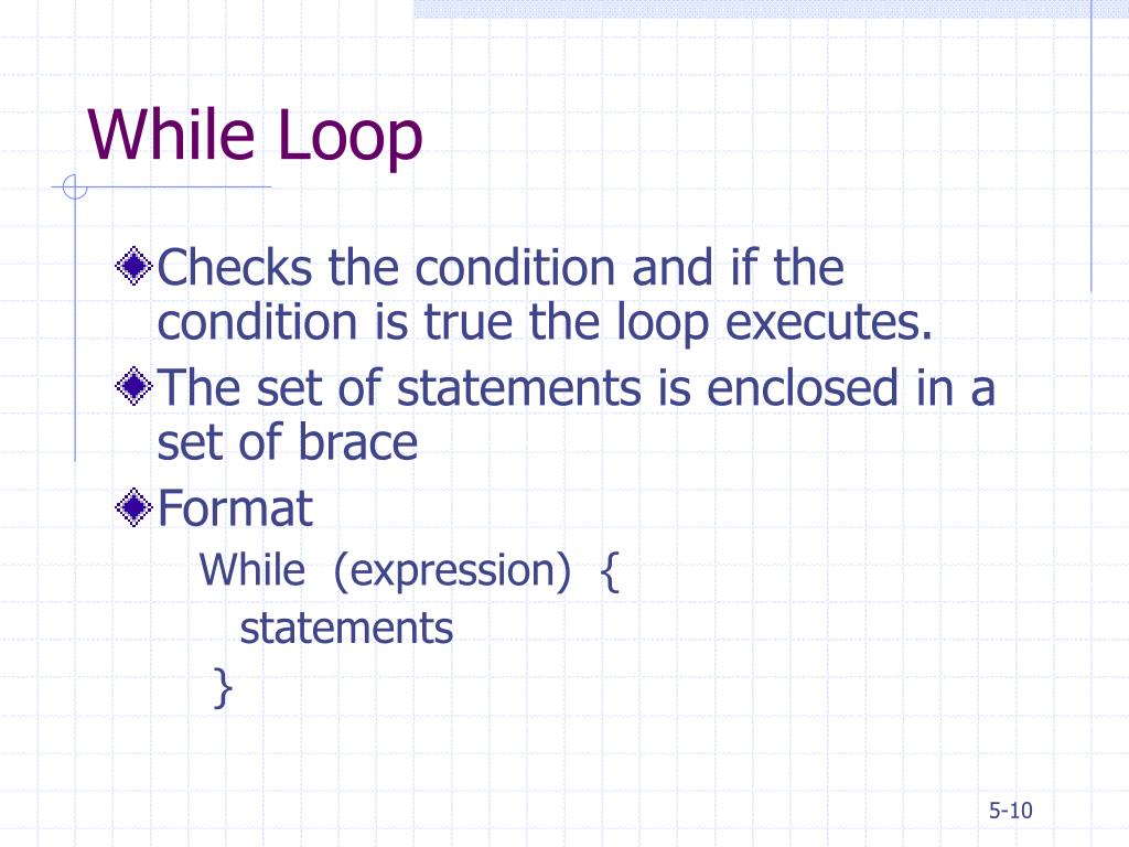 While Loop • Checks the condition and if the condition is true the loop executes. • The set of statements is enclosed in a set of brace • Format While (expression) { statements }