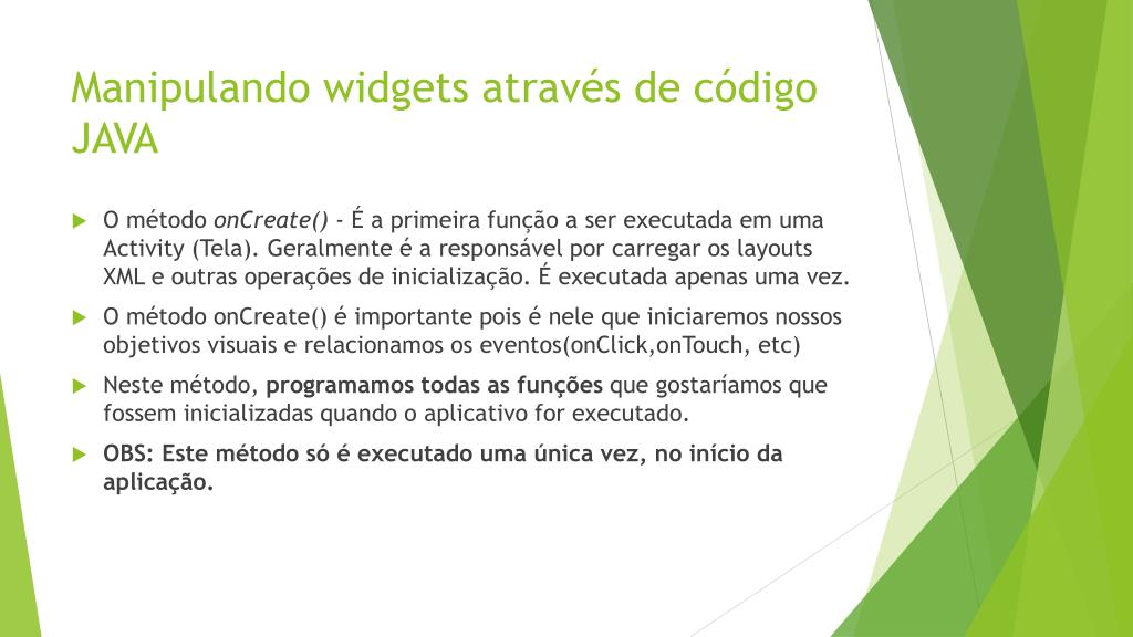 Manipulando widgets através de código JAVA • O método onCreate() - É a primeira função a ser executada em uma Activity (Tela). Geralmente é a responsável por carregar os layouts XML e outras operações de inicialização. É executada apenas uma vez. • O método onCreate() é importante pois é nele que iniciaremos nossos objetivos visuais e relacionamos os eventos(onClick,onTouch, etc) • Neste método, programamos todas as funções que gostaríamos que fossem inicializadas quando o aplicativo for executado. • OBS: Este método só é executado uma única vez, no início da aplicação.