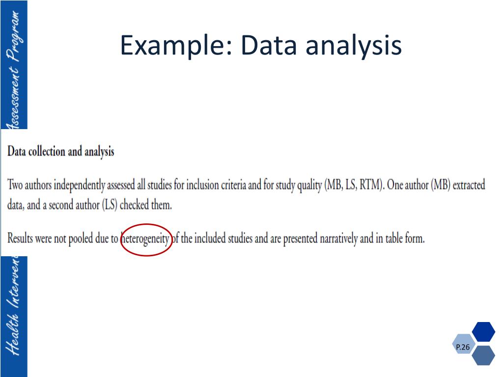 Example: Cochrane risk of bias tool Cochrane handbook for systematic reviews of interventions • http://www.cochrane-handbook.org/