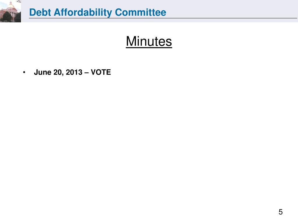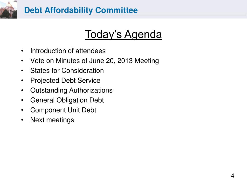 Today’s Agenda • Introduction of attendees • Vote on Minutes of June 20, 2013 Meeting • States for Consideration • Projected Debt Service • Outstanding Authorizations • General Obligation Debt • Component Unit Debt • Next meetings