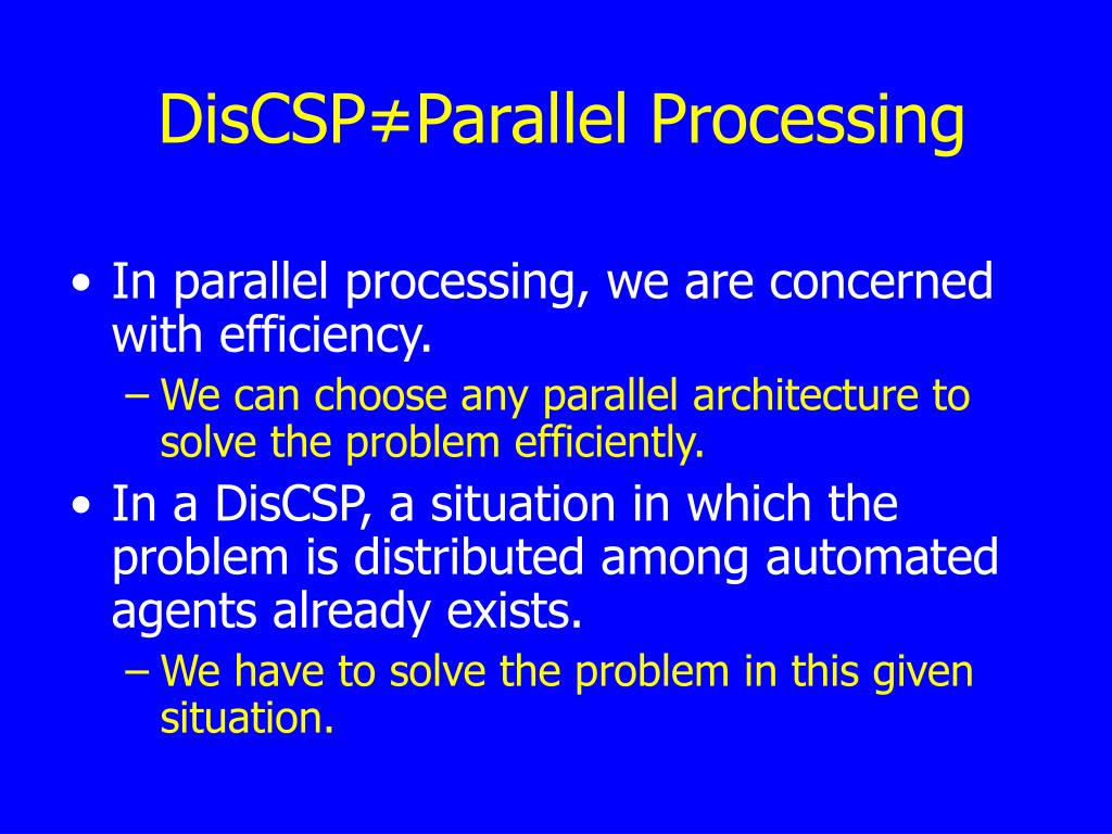 DisCSP≠Parallel Processing • In parallel processing, we are concerned with efficiency. • We can choose any parallel architecture to solve the problem efficiently. • In a DisCSP, a situation in which the problem is distributed among automated agents already exists. • We have to solve the problem in this given situation.
