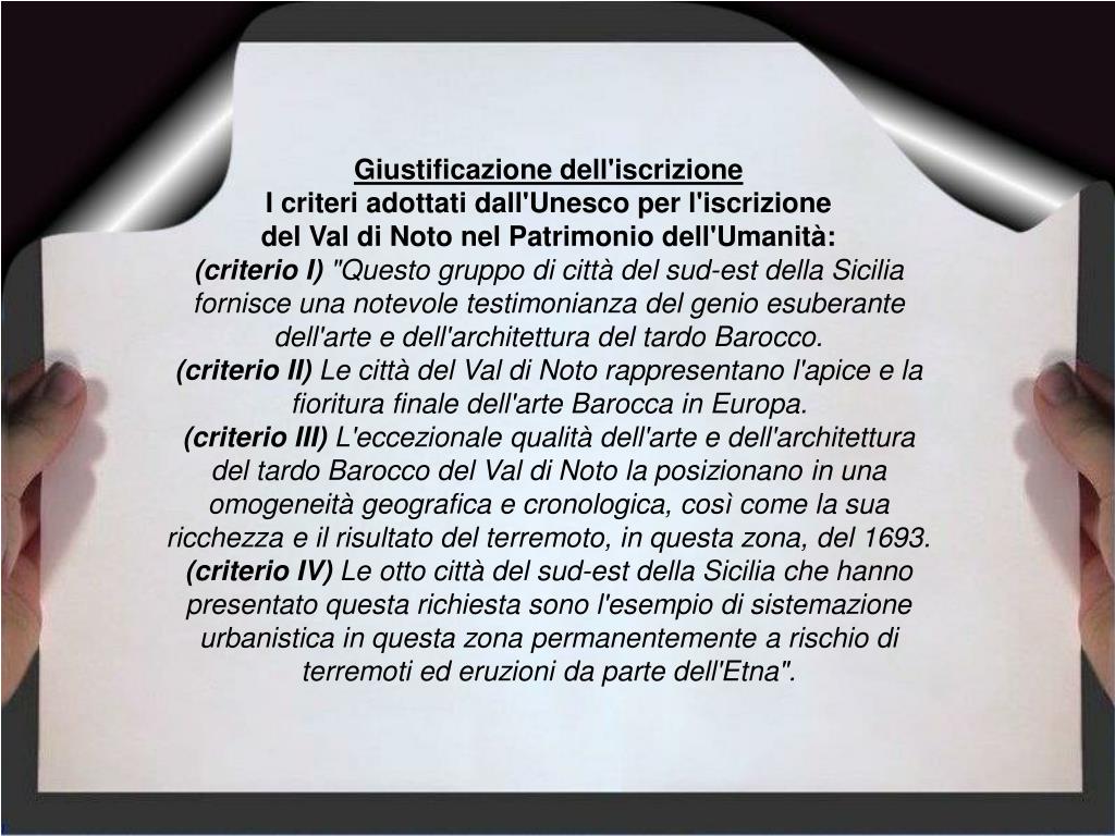 Giustificazione dell'iscrizione I criteri adottati dall'Unesco per l'iscrizione del Val di Noto nel Patrimonio dell'Umanità: (criterio I) "Questo gruppo di città del sud-est della Sicilia fornisce una notevole testimonianza del genio esuberante dell'arte e dell'architettura del tardo Barocco. (criterio II) Le città del Val di Noto rappresentano l'apice e la fioritura finale dell'arte Barocca in Europa. (criterio III) L'eccezionale qualità dell'arte e dell'architettura del tardo Barocco del Val di Noto la posizionano in una omogeneità geografica e cronologica, così come la sua ricchezza e il risultato del terremoto, in questa zona, del 1693. (criterio IV) Le otto città del sud-est della Sicilia che hanno presentato questa richiesta sono l'esempio di sistemazione urbanistica in questa zona permanentemente a rischio diterremoti ed eruzioni da parte dell'Etna".