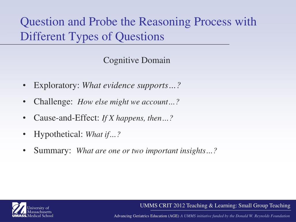 Question and Probe the Reasoning Process with Different Types of Questions Cognitive Domain • Exploratory: What evidence supports…? • Challenge: How else might we account…? • Cause-and-Effect: If X happens, then…? • Hypothetical: What if…? • Summary: What are one or two important insights…?