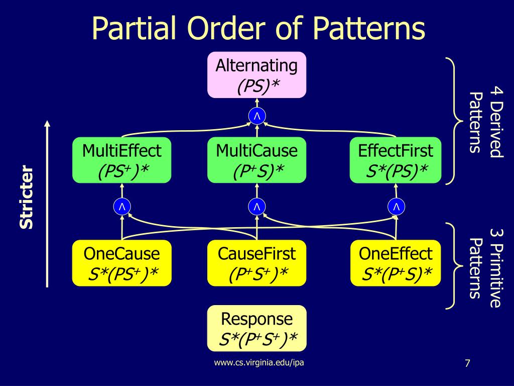 Partial Order of Patterns Alternating (PS)* 4 Derived Patterns Λ MultiCause (P+S)* EffectFirst S*(PS)* MultiEffect (PS+)* Stricter Λ Λ Λ OneCause S*(PS+)* CauseFirst (P+S+)* OneEffect S*(P+S)* 3 Primitive Patterns Response S*(P+S+)* www.cs.virginia.edu/ipa