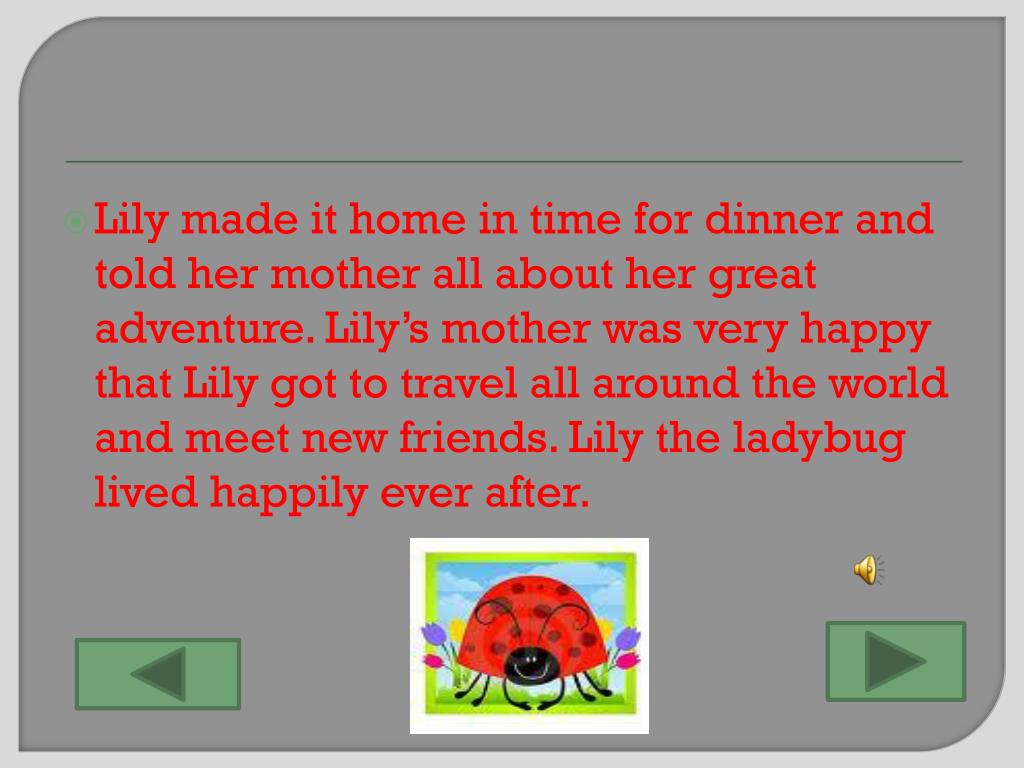 Lily made it home in time for dinner and told her mother all about her great adventure. Lily’s mother was very happy that Lily got to travel all around the world and meet new friends. Lily the ladybug lived happily ever after.