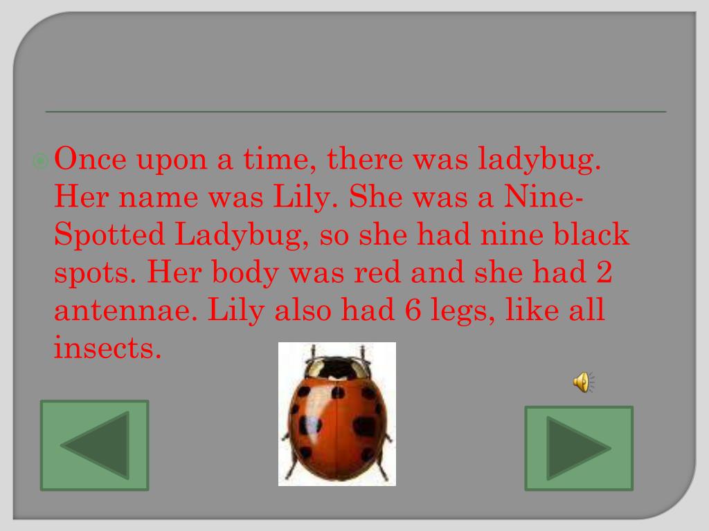 A LADY BUG’S ADVENTURE Britney Beck. Once upon a time, there was ladybug. Her name was Lily. She was a Nine-Spotted Ladybug, so she had nine black spots. Her body was red and she had 2 antennae. Lily also had 6 legs, like all insects. .